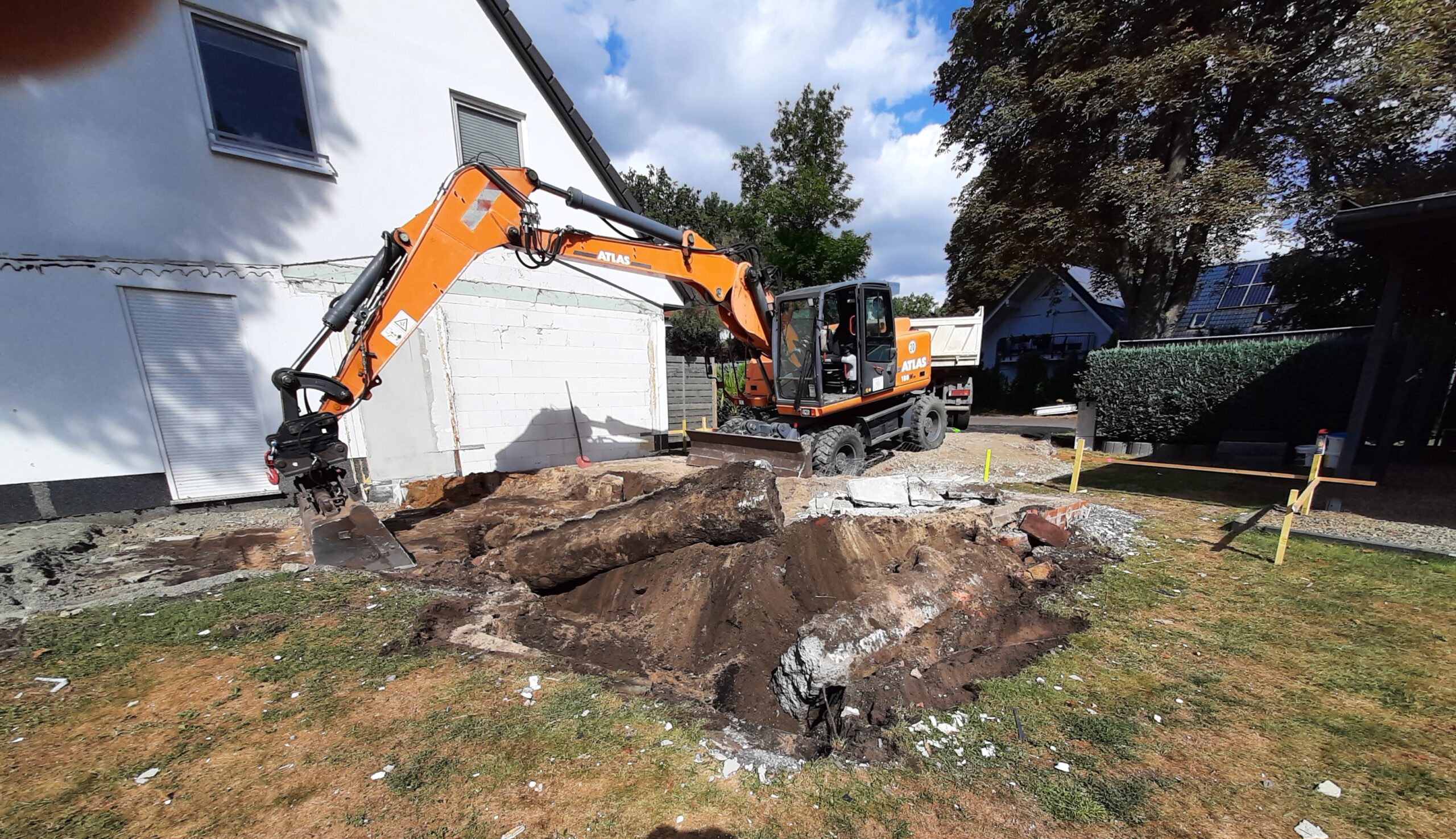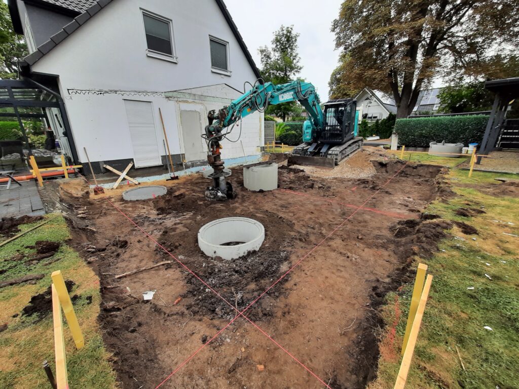 Leistungen: Erdbau , Abbrucharbeiten (Baustellenzufahrt und Baustraße herstellen, Abbruch alte Bodenplatte, Brunnengründung mit Schachtringen id. 1,00 m , Tragschicht unter Bodenplatte, Streifenfundamentaushub)