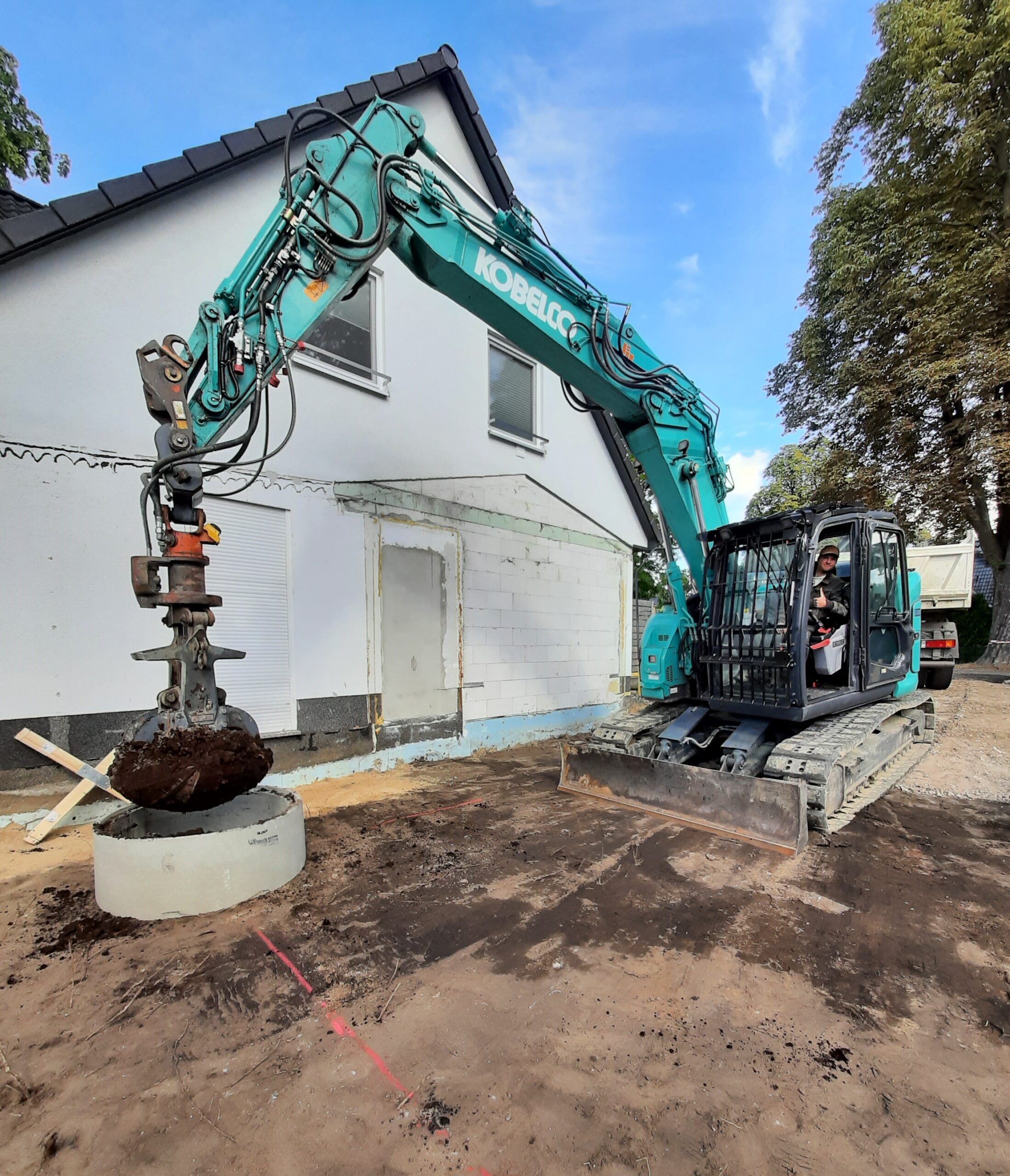 Leistungen: Erdarbeiten, Abwasseranschluss (Bodenaustausch, Fundamentaushub, Abwasseranschluss herstellen)